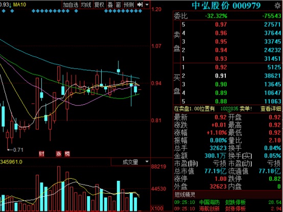 今明兩天,張永宏護(hù)衛(wèi)股價任務(wù)艱巨。今日,中弘股份0.92元/股開盤,漲1.10%