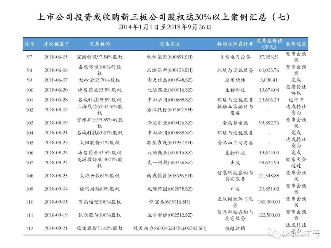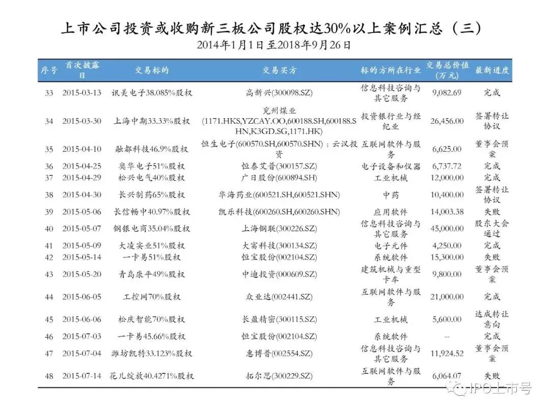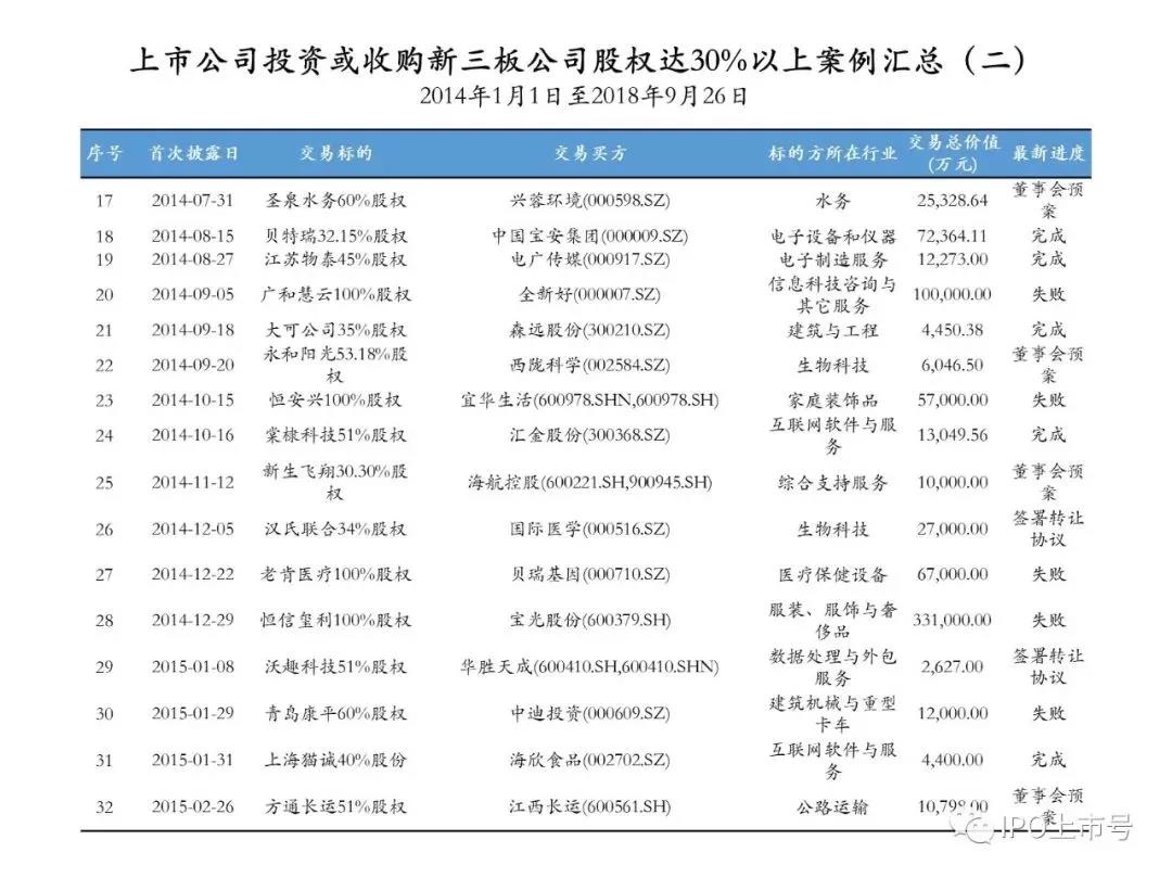 后續(xù)的表格中列舉的是自2014年1月1日至2018年9月26日上市公司投資或收購新三板企業(yè)股權(quán)達30%以上的案例,但是由于收集手段、收集途徑和精力的問題,可能存在掛一漏萬、錯漏百出的情形,還請各位讀者自行甄別,如下的案例僅供參考: