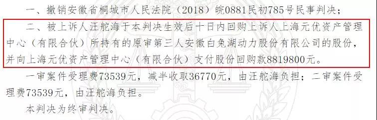 終審判決撤銷一審判決,汪舵海需于判決生效后十日內(nèi),回購上海元優(yōu)持有的白兔湖股份,并向上海元優(yōu)支付股份回購款881.98萬元。