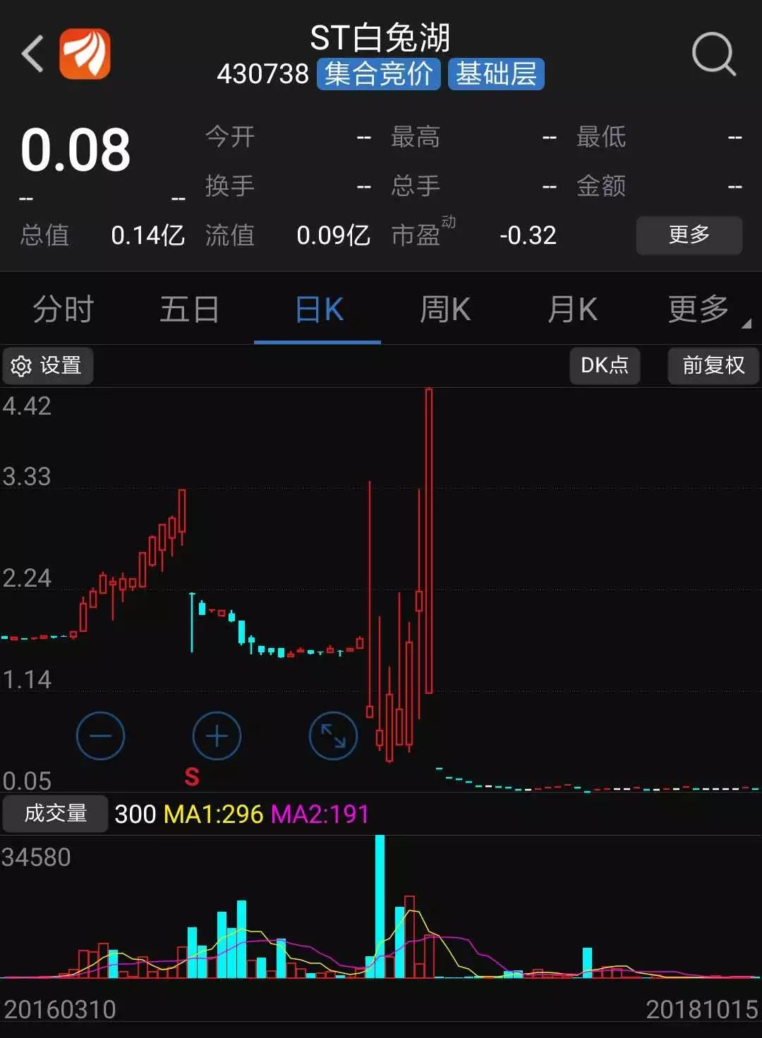 2018年10月15日,白兔湖收盤價僅有0.08元/股。據(jù)此計算,上海元優(yōu)浮虧已超95%。