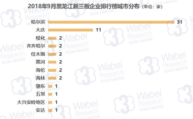 截止到2018年9月30日,新三板共有10946家掛牌公司,黑龍江有97家新三板企業(yè),占比0.9%;其中58家企業(yè)有市值,占比59.8%。