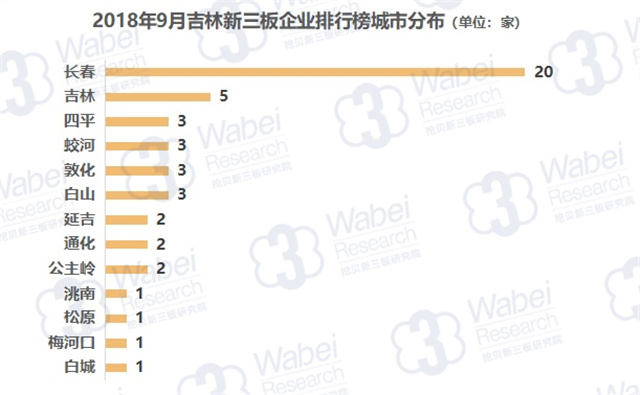 截止到2018年9月30日,新三板共有10946家掛牌公司,吉林有88家新三板企業(yè),占比0.8%;其中47家企業(yè)有市值,占比53.4%。