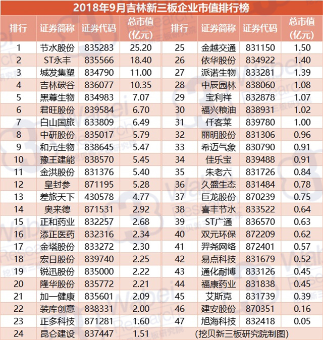 附:2018年9月吉林新三板企業(yè)市值排行榜
