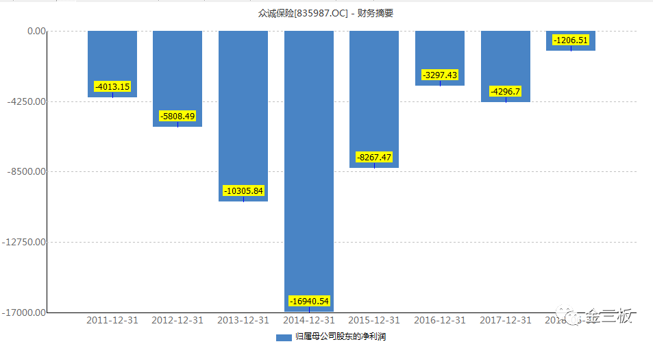 更重要的是,2011年成立至今,眾誠保險從未盈利,截至2018年中報,公司累計未分配利潤-5.41億元。就這一項來看,眾誠保險在一萬多家新三板公司中,高居前十。