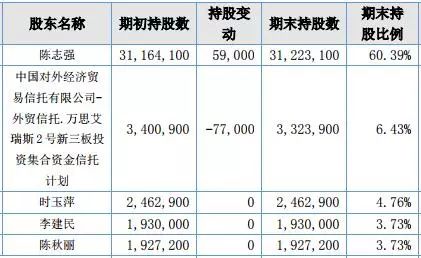 值得一提的是,環(huán)宇裝備2018年半年報顯示,中國對外經(jīng)濟貿(mào)易信托有限公司-外貿(mào)信托.萬思艾瑞斯2號新三板投資集合資金信托計劃在報告期減持了7.7萬股股份,期末還持有332.39萬股股份。