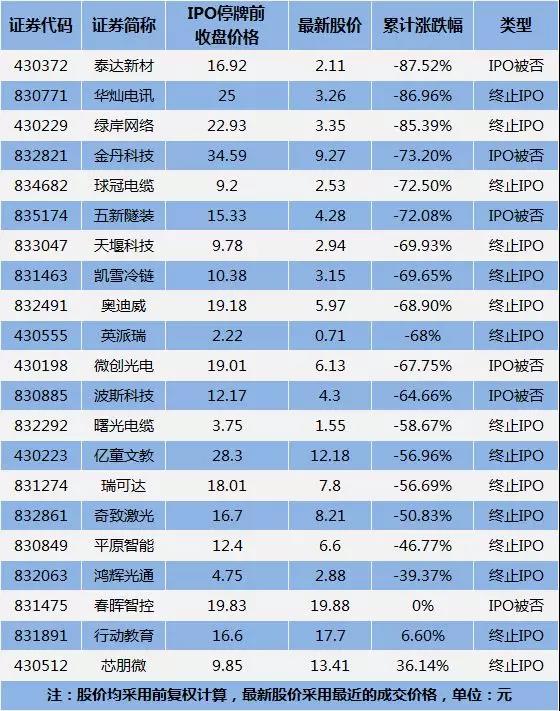 出去摘牌以及無成交的公司,剩下的公司中,那些曾經(jīng)采用過做市轉(zhuǎn)讓、股東人數(shù)較多的,在IPO失敗后復(fù)牌時大多都出現(xiàn)了暴跌。下跌50%基本屬于“正常水平”,多的跌幅會超過70%甚至80%。