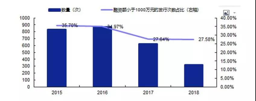 據(jù)安信證券統(tǒng)計,2015年至今,新三板公司單次定增融資金額小于1000萬元的發(fā)行次數(shù)占比達到20%-30%左右,體現(xiàn)了掛牌中小企業(yè)“小額快速”的融資特點。