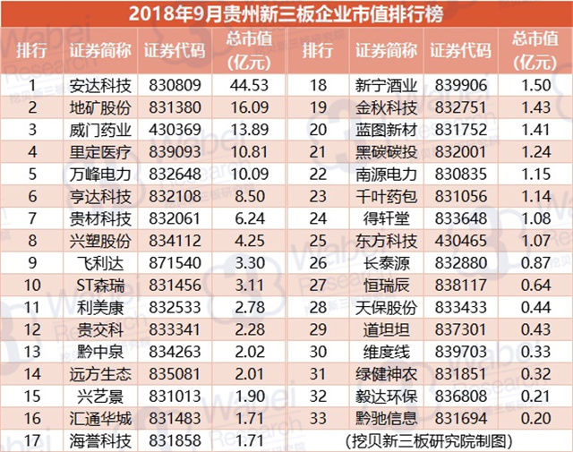 附:2018年9月貴州新三板企業(yè)市值排行榜