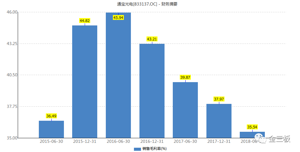 通寶光電2018年上半年業(yè)績(jī)下滑的更快,上半年實(shí)現(xiàn)營(yíng)業(yè)收入1.47億元,同比下降11.81%,歸屬于掛牌公司股東的凈利潤(rùn)為3107.68萬(wàn)元,同比下降27.01%,扣非后凈利潤(rùn)3074.13萬(wàn)元,同比下降27.35%。