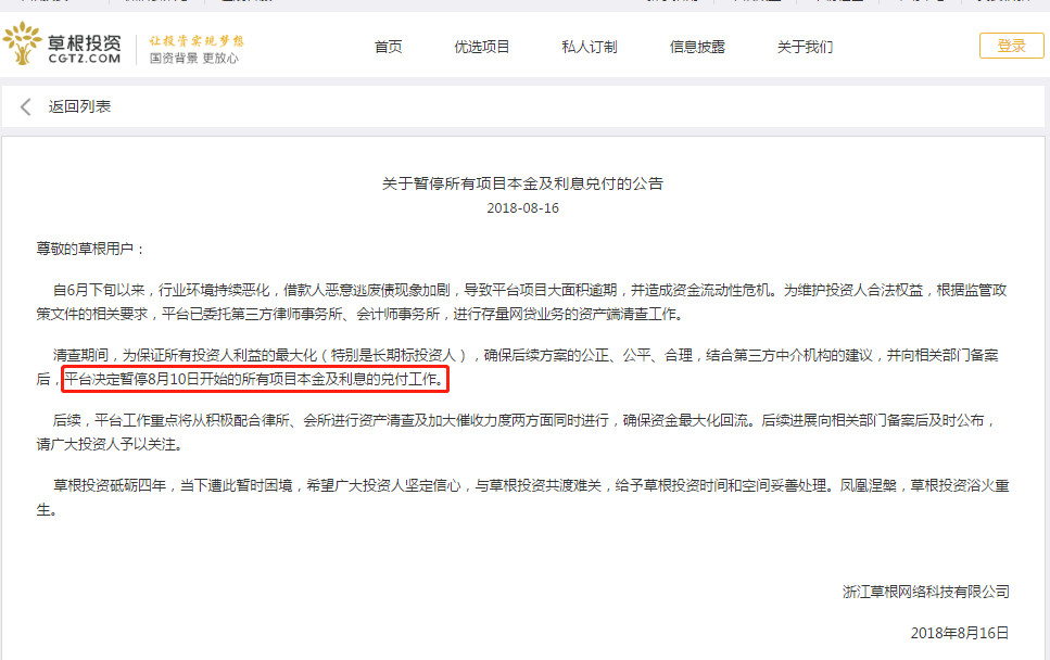 8月16日,草根投資發(fā)布關于平臺實施 “涅槃計劃”及近期工作的匯報,與此同一天,草根投資決定暫停8月10日開始的所有項目本金及兌付工作。