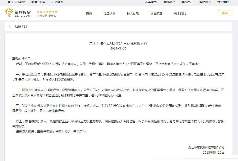 盡管如此,還是有不少投資人不買賬,隨即,草根投資在8月10日發(fā)布《關于不建議近期投資人自行催收的公告》。