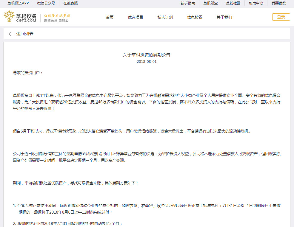 事實上,到了7月31日,草根投資資金出現(xiàn)問題,投資者紛紛討要說法,草根投資再也偽裝不下去了,在有關部門的主持下,草根投資在8月1日上午召開了投資者見面會,下午發(fā)布了展期公告。