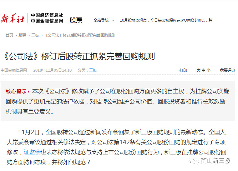 10月26日,全國人大常委會正式審議通過相關(guān)修改決定,對公司法第142條有關(guān)公司股份回購的規(guī)定進(jìn)行了專項修改。新增回購情形、簡化決策程序、建立庫存股制度,讓公司回購自由度大幅提升。筆者認(rèn)為在當(dāng)前,股份回購在新三板掛牌企業(yè)中有著很強(qiáng)的市場需求,相關(guān)制度的優(yōu)化和落地也具有較強(qiáng)的急迫性。