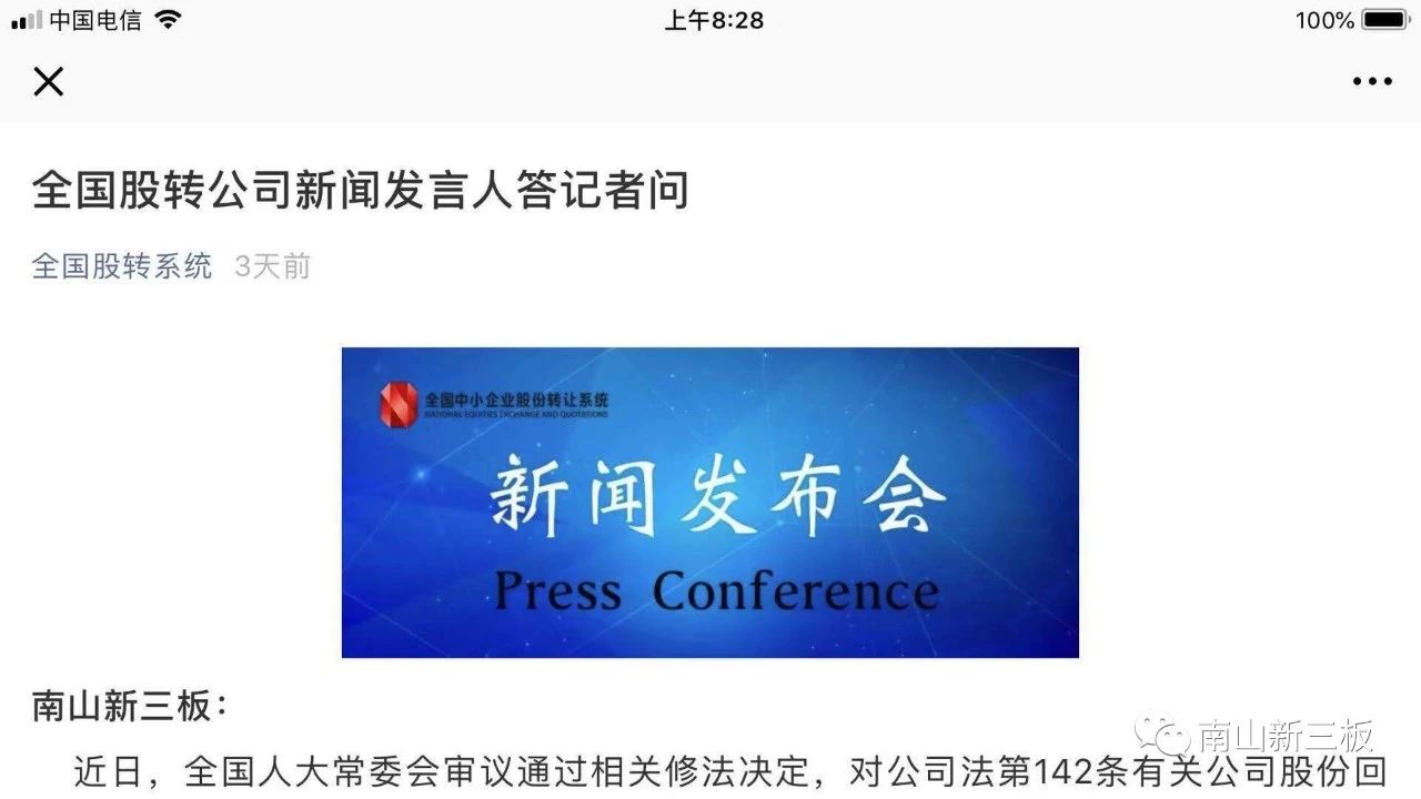 11月2日,全國股轉(zhuǎn)公司通過新聞發(fā)布會回復(fù)了新三板回購規(guī)則的最新動態(tài)。南山新三板問及,全國人大常委會審議通過相關(guān)修法決定,對公司法第142條有關(guān)公司股份回購的規(guī)定進(jìn)行了專項修改,證監(jiān)會也表態(tài)將依法規(guī)范與支持上市公司股份回購行為,新三板在掛牌公司股份回購方面持何態(tài)度,并將如何規(guī)范?