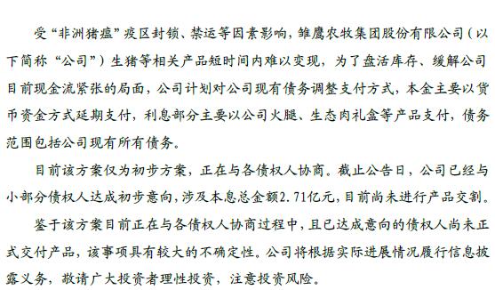 鷹農牧稱,為了盤活庫存、緩解公司目前現金流緊張的局面,公司計劃用火腿、生態(tài)肉禮盒等產品支付債務利息。目前該方案僅為初步方案,正在與各債權人協商。截止公告日,公司已經與小部分債權人達成初步意向,涉及本息總金額2.71億元,目前尚未進行產品交割。