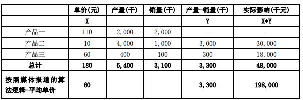 以上示例顯示由于產(chǎn)品一、二、三的單價不同,根據(jù)產(chǎn)量和銷量的變化,對于存貨的余額實際影響為 4,800 萬元,按照媒體報道的算法邏輯,產(chǎn)品平均單價為 60 元,對于存貨的余額影響為 19,800 萬元。以上案例說明,簡單的按照產(chǎn)量和銷量去推測存貨余額的變化是不合理的和扭曲計算結果的,特別是在與單價低的產(chǎn)品產(chǎn)量高于銷量的情況下,對于存貨的影響會夸大。