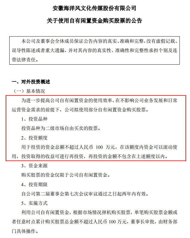 海洋風(fēng)擬使用不超過100萬元人民幣,根據(jù)市場(chǎng)情況擇機(jī)購買二級(jí)市場(chǎng)自由買賣的股票。這是最新的一起新三板公司準(zhǔn)備投資炒股案例。