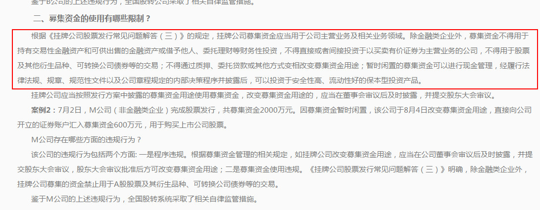 根據(jù)股轉(zhuǎn)公司發(fā)布的規(guī)定,掛牌公司募集資金應(yīng)用于公司主營業(yè)務(wù)及相關(guān)領(lǐng)域。除金融類企業(yè)外,募集資金不得直接或間接投資于以買賣有價(jià)證券為主業(yè)的公司,不得用于股票及其他衍生品種、可轉(zhuǎn)換公司債券等的交易。