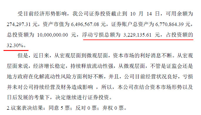 公告顯示,受經(jīng)濟(jì)形勢(shì)影響,公司證券投資截止到10月14日可用余額為27.43萬元,資產(chǎn)市值為649.7萬元,證券賬戶總資產(chǎn)為677萬元。公司總投資額為1000萬元,浮虧達(dá)323萬元,占投資額的32.3%。