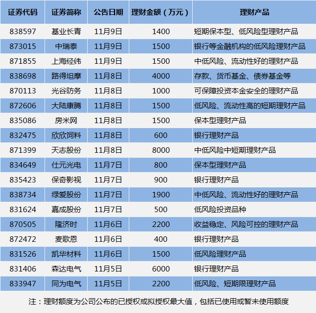 ▲11月5日-11月9日新三板公司公告理財(cái)情況
