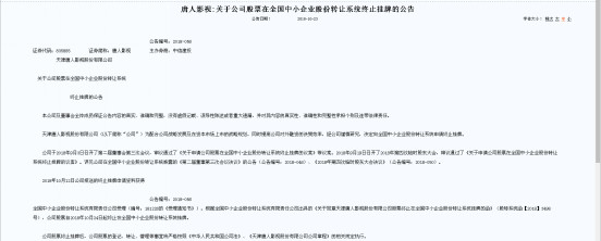 近期,多個明星參股影視公司從新三板摘牌。比如,10月23日,胡歌、古力娜扎參股的唐人影視發(fā)布《關于公司股票在全國中小企業(yè)股份轉讓系統(tǒng)終止掛牌的公告》。而早在5月29日,楊冪參股的嘉行傳媒就發(fā)布了新三板終止掛牌的公告。另外,還有周筆暢、韓庚持股的樂華文化。