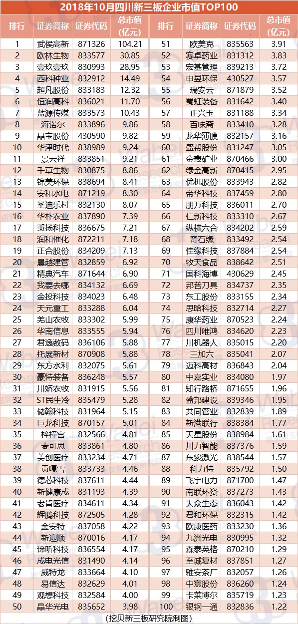 附:2018年10月四川新三板企業(yè)市值TOP100