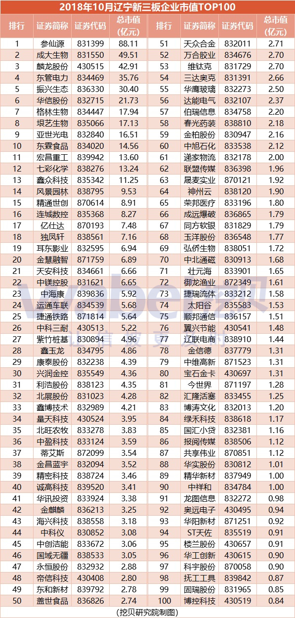 附:2018年10月遼寧新三板企業(yè)市值TOP100